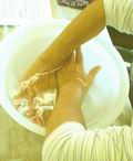 | セルフケア1.手浴/ハンドバス 手の血行がよくなると、肩の緊張もほぐれてきます。 用意するもの: 精油・・・3滴 お湯・・・手首がつかるくらいの量 洗面器 やりかた: 1.洗面器にお湯(40-45℃が目安)をはります。 2.お湯の中に精油をおとし、よく混ぜます。 3.手首までお湯につけて、10分程度温めます。 |
