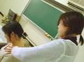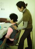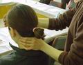 | 3.首の付け根〜耳のうしろ〜こめかみ ここから、ブレンドオイルを使います。 トリートメントする首の側に立ちます。マッサージしないほう の手は、相手の額におき、頭を支えます。 親指で、小さな 円を描くようにマッサージします。 |