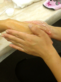 | ●実習その4.ハンドマッサージ(ペアで) オイルをすりこみながら、やさしくマッサージしましょう。 乾燥で荒れてしまった肌もふっくら整います。 |